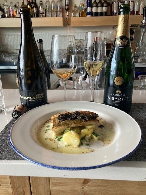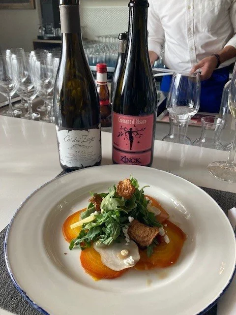 For the first course, two sparkling wines - Ca dei Zago Prosecco DOCG and Domaine Zinck Cremant d’Alsace Rose - were chosen to pair with either the Mushroom Ravioli or the Heirloom Beet Salad . The wines couldn’t be more different. The Ca’ dei Zago Prosecco is a Colfondo, a term that translates to “in the bottom.” This refers to the secondary fermentation occurring directly in the bottle, a process noted on the label as “Rifermentato in Bottiglia” Colfondo Prosecco is typically frizzante (lightly sparkling) and has a cloudy appearance due to the sediment it retains. Its flavour profile leans more sour than sweet, which might not appeal to everyone—but I absolutely love it! Ca’ dei Zago is an excellent example of this style. I often think of Colfondo as the “cerebral Prosecco,” as there’s so much complexity.
